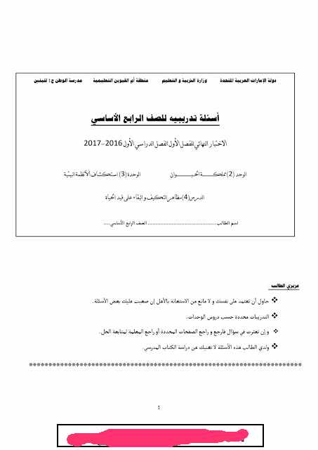 أسئلة تدريبية للصف الرابع الأساسي في العلوم الفصل الدراسي الأول 2016 2017