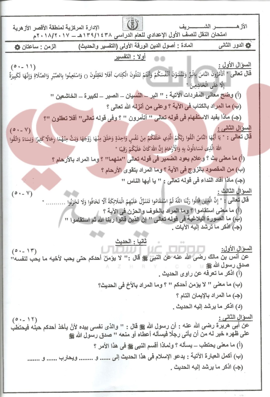 نماذج أسئلة الامتحانات الصف الأول الإعدادى والثانى الاعدادى الازهرى 2018 2019