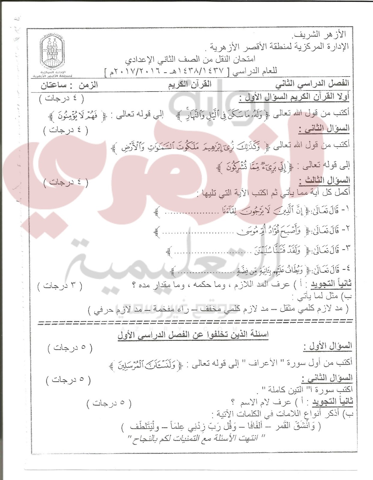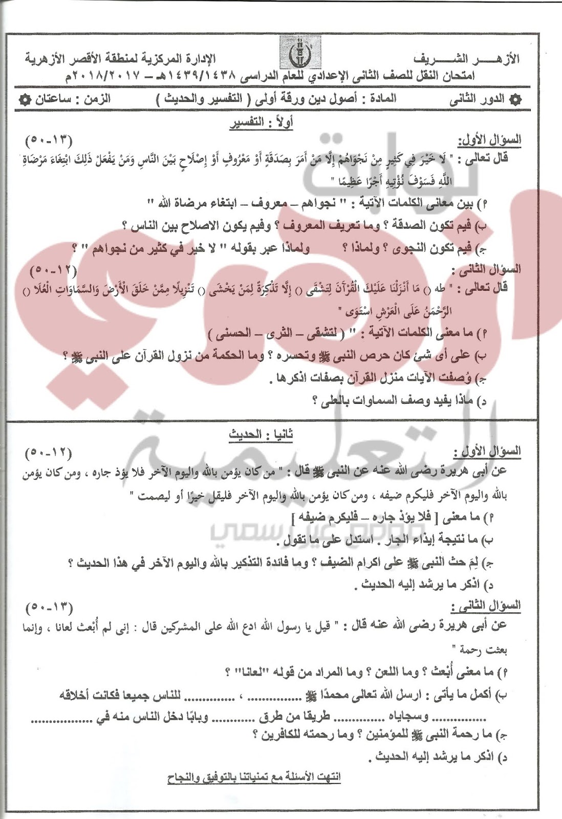 نماذج امتحانات الثاني الاعدادي الازهري بالاقصر ترم ثان 2017