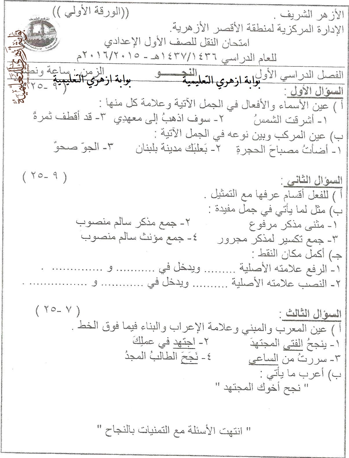 نماذج امتحانات اول اعدادي ترم اول لعام 2016