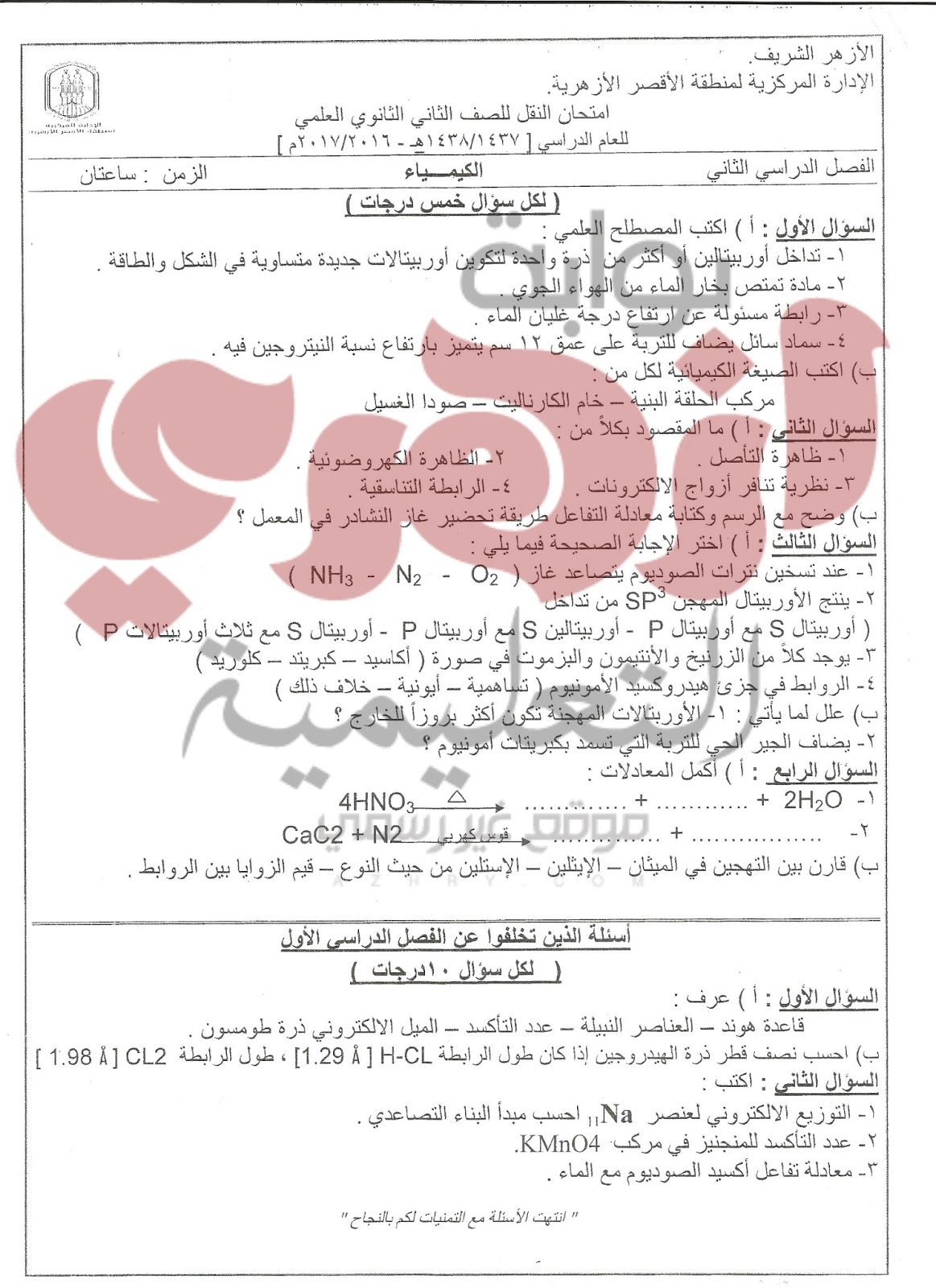 نماذج امتحانات الثاني الثانوي علمي الازهري بالاقصر ترم ثان 2017