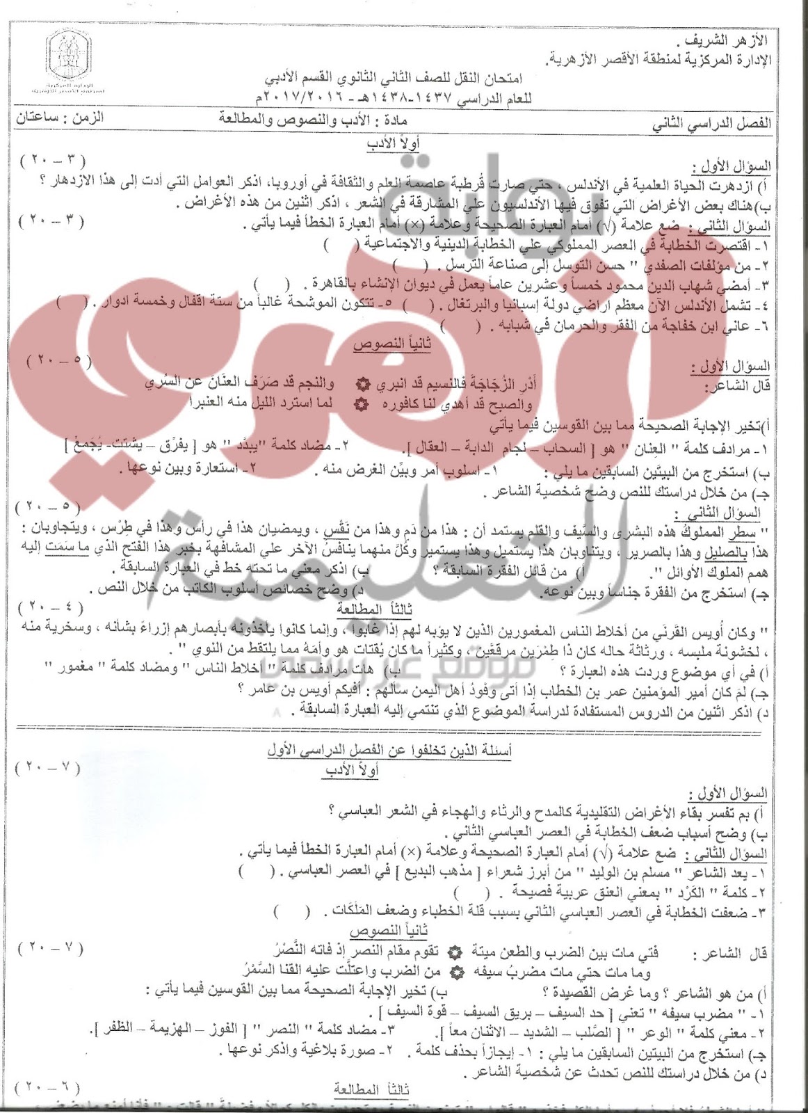 نماذج امتحانات الثاني الثانوي ادبي الازهري بالاقصر ترم ثان 2017